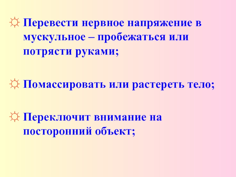 Слайд 26Перевести нервное напряжение в мускульное – пробежаться или потрясти руками;