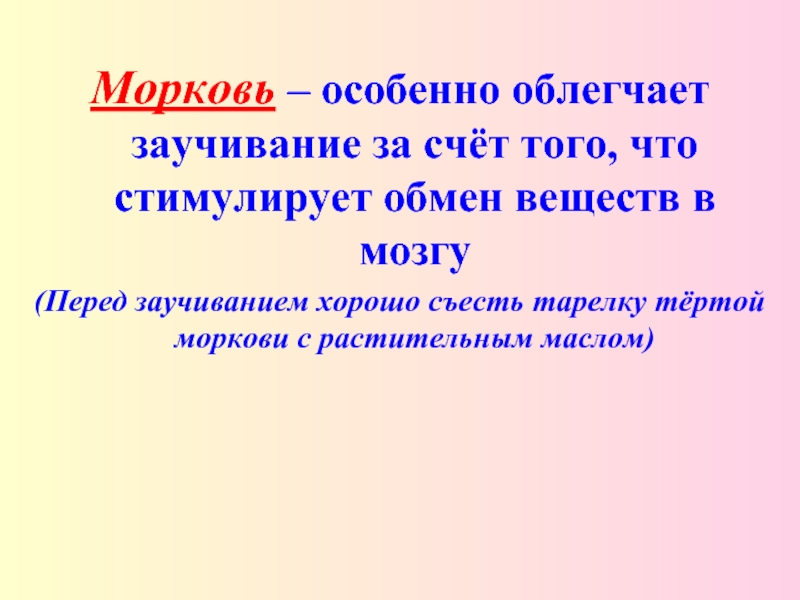 Слайд 4Морковь – особенно облегчает заучивание за счёт того, что стимулирует обмен