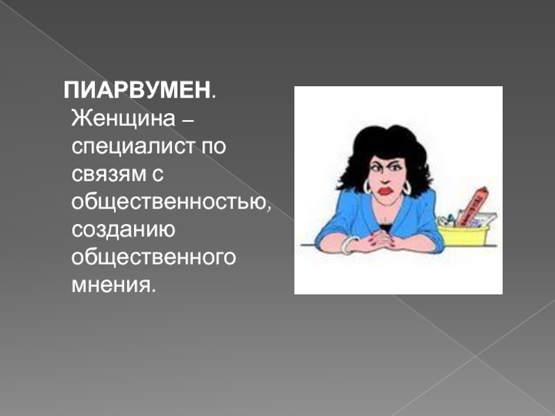 Слайд 23 ПИАРВУМЕН. Женщина – специалист по связям с общественностью, созданию