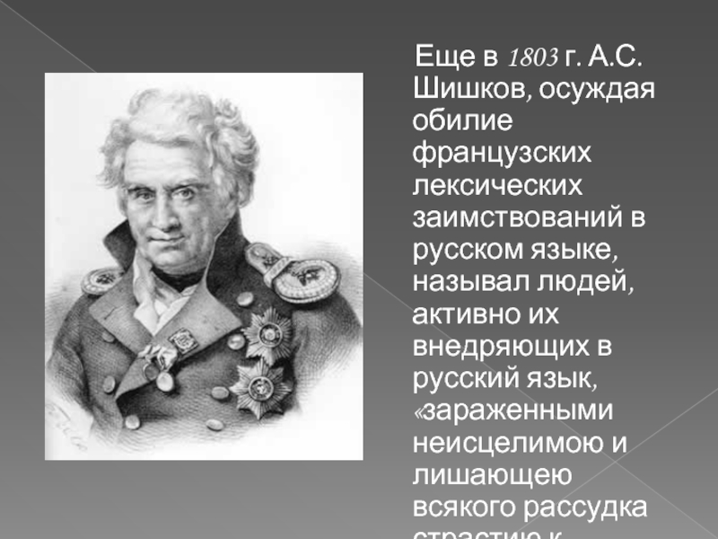 Слайд 9 Еще в 1803 г. А.С.Шишков, осуждая обилие французских