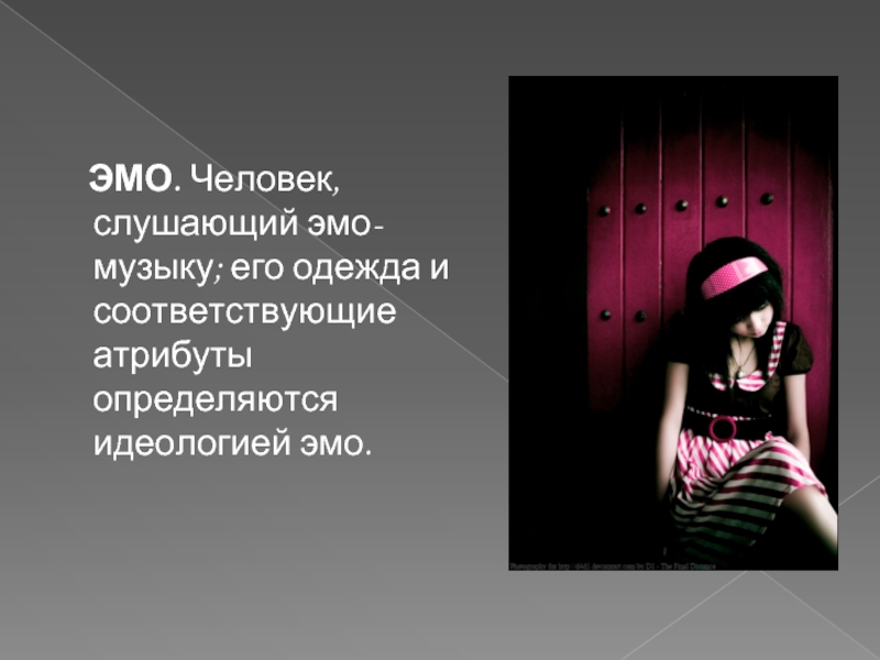 Слайд 33 ЭМО. Человек, слушающий эмо-музыку; его одежда и соответствующие атрибуты