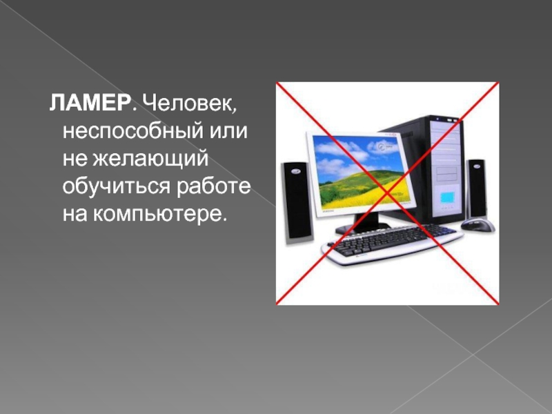 Слайд 19 ЛАМЕР. Человек, неспособный или не желающий обучиться работе на компьютере.