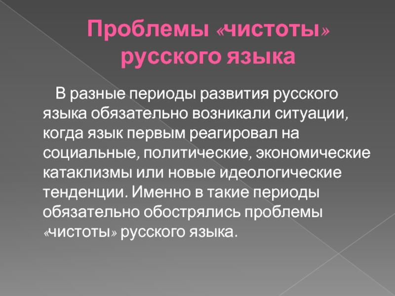 русского языка обязательно возникали ситуации, когда язык первым реагировал на социальные, политические, экономические катаклизмы или новые идеологические тенденции. Именно в такие периоды обязательно обострялись проблемы «чистоты» русского языка.