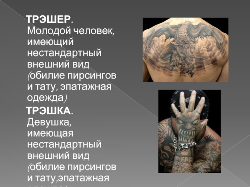 Слайд 28 ТРЭШЕР. Молодой человек, имеющий нестандартный внешний вид (обилие пирсингов