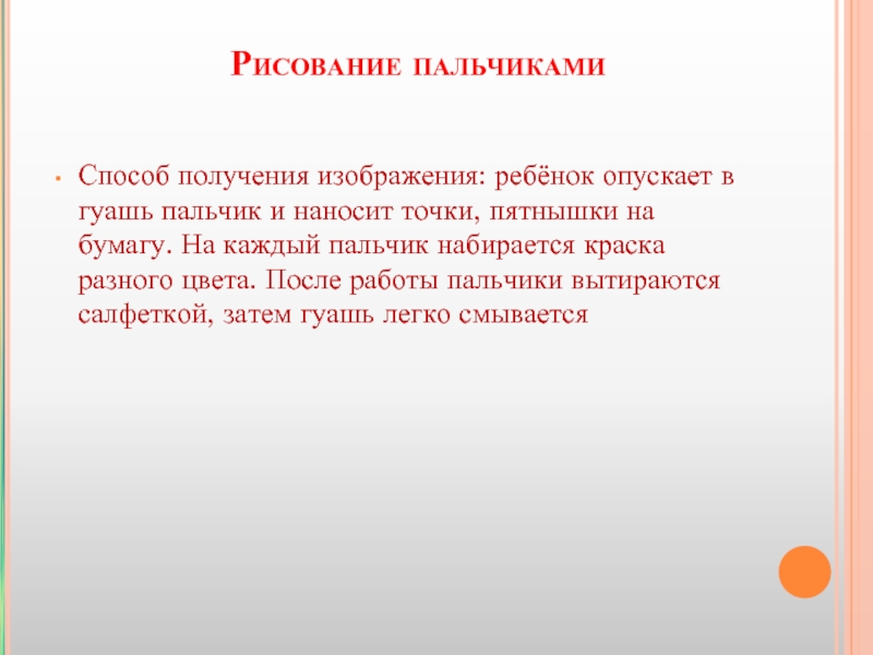 точки, пятнышки на бумагу. На каждый пальчик набирается краска разного цвета. После работы пальчики вытираются салфеткой, затем гуашь легко смывается