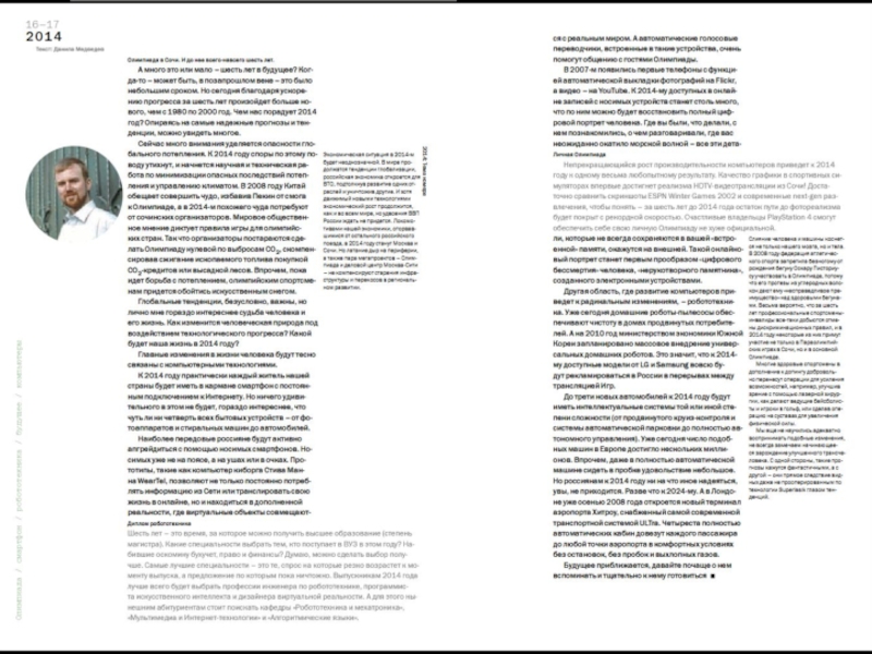 Через весь номер: сноски, перекрестные ссылки, таблицы (2014 - среднегодовая температура, цена доллара, новая карта мира, президент США, президент России, самые растущие экономики, кто получит премии вроде Нобелевской и т.п.)