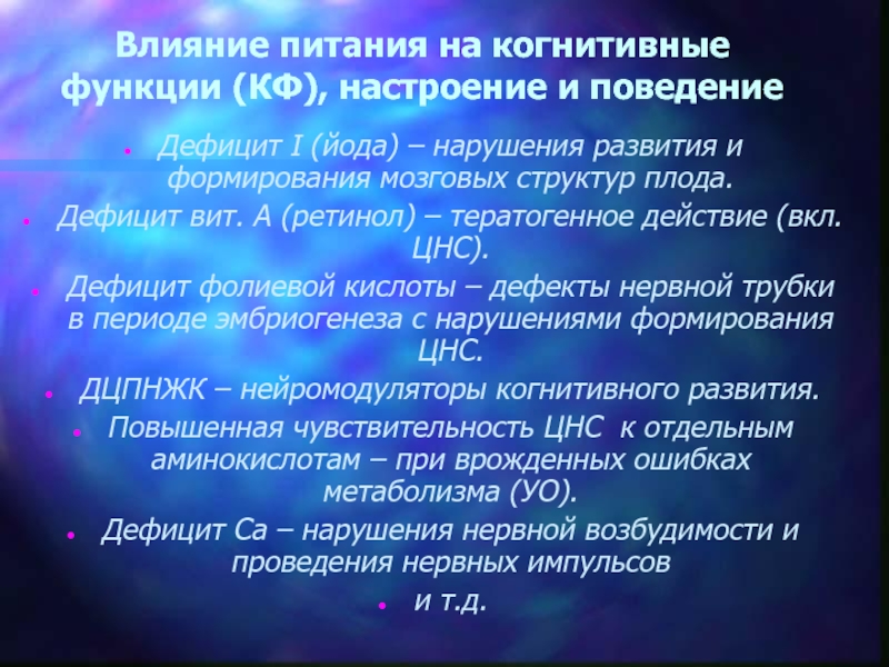 Слайд 9Влияние питания на когнитивные функции (КФ), настроение и поведение