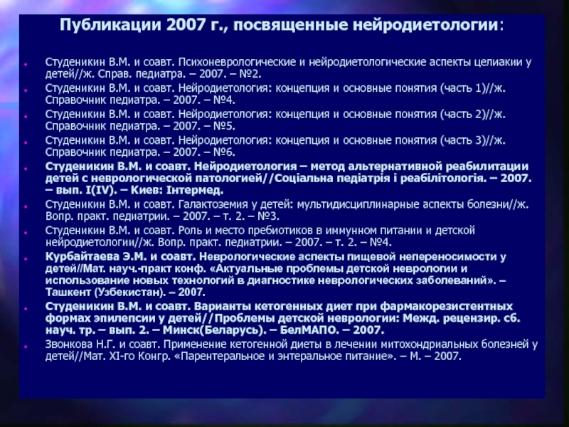 Слайд 2Публикации 2007 г., посвященные нейродиетологии: