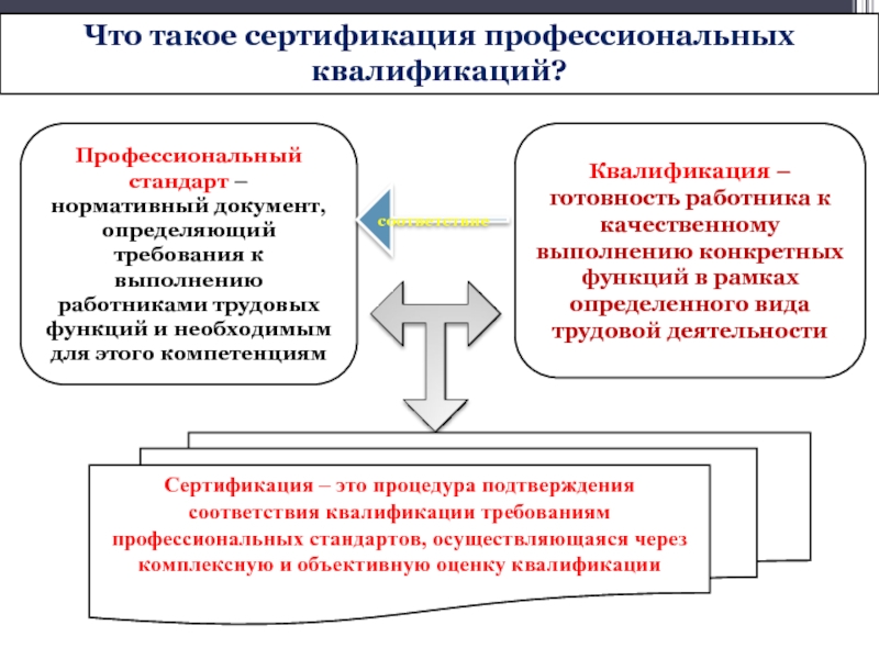 Сертификация – это процедура подтверждения соответствия квалификации требованиям профессиональных стандартов, осуществляющаяся через комплексную и объективную оценку квалификации