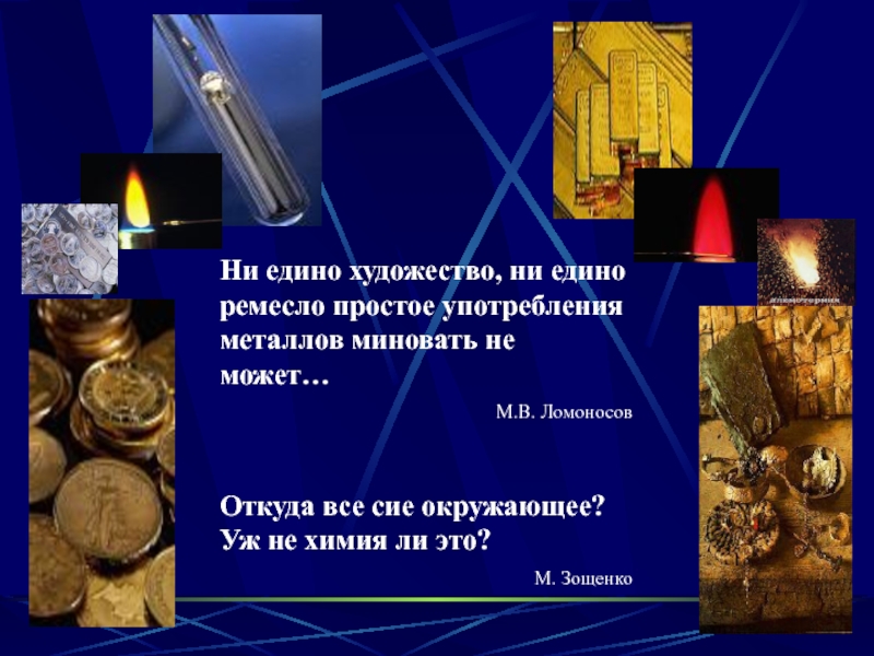 Ни едино художество, ни едино ремесло простое употребления металлов миновать не может… М.В. Ломоносов Откуда все сие окружающее? Уж не химия ли это? М. презентация