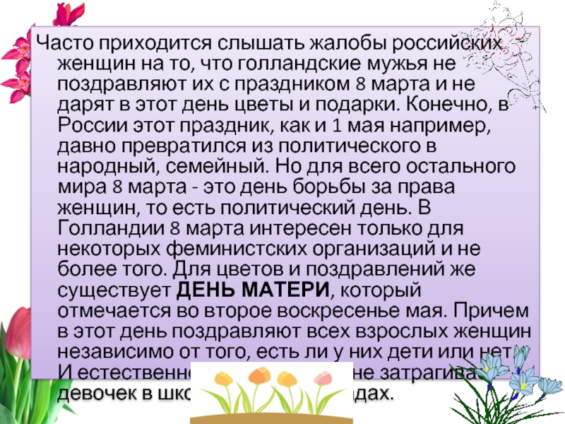 не поздравляют их с праздником 8 марта и не дарят в этот день цветы и подарки. Конечно, в России этот праздник, как и 1 мая например, давно превратился из политического в народный, семейный. Но для всего остального мира 8 марта - это день борьбы за права женщин, то есть политический день. В Голландии 8 марта интересен только для некоторых феминистских организаций и не более того. Для цветов и поздравлений же существует ДЕНЬ МАТЕРИ, который отмечается во второе воскресенье мая. Причем в этот день поздравляют всех взрослых женщин независимо от того, есть ли у них дети или нет. И естественно, этот праздник не затрагивает девочек в школах и детских садах.