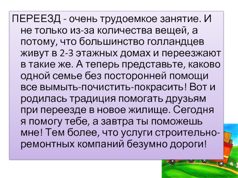 а потому, что большинство голландцев живут в 2-3 этажных домах и переезжают в такие же. А теперь представьте, каково одной семье без посторонней помощи все вымыть-почистить-покрасить! Вот и родилась традиция помогать друзьям при переезде в новое жилище. Сегодня я помогу тебе, а завтра ты поможешь мне! Тем более, что услуги строительно-ремонтных компаний безумно дороги!