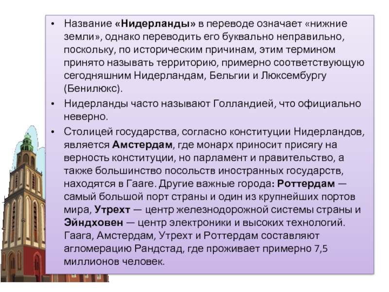 Слайд 3Название «Нидерланды» в переводе означает «нижние земли», однако переводить его буквально