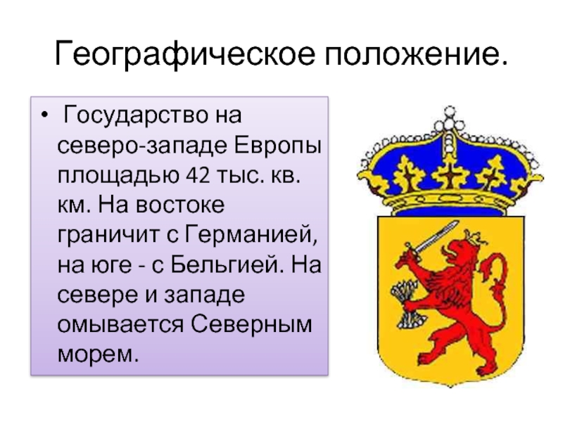 востоке граничит с Германией, на юге - с Бельгией. На севере и западе омывается Северным морем.