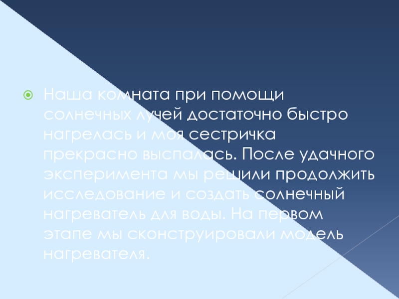 Слайд 4Наша комната при помощи солнечных лучей достаточно быстро нагрелась и моя