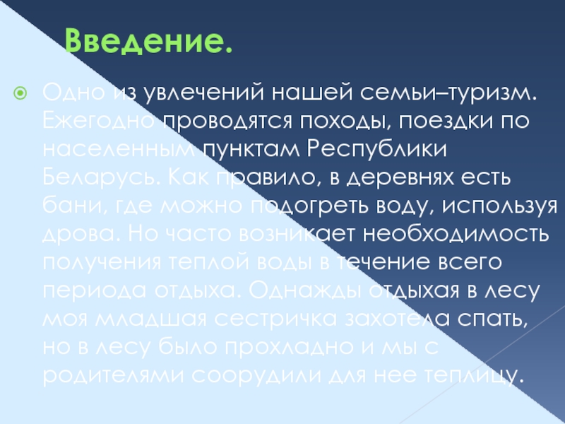 пунктам Республики Беларусь. Как правило, в деревнях есть бани, где можно подогреть воду, используя дрова. Но часто возникает необходимость получения теплой воды в течение всего периода отдыха. Однажды отдыхая в лесу моя младшая сестричка захотела спать, но в лесу было прохладно и мы с родителями соорудили для нее теплицу.