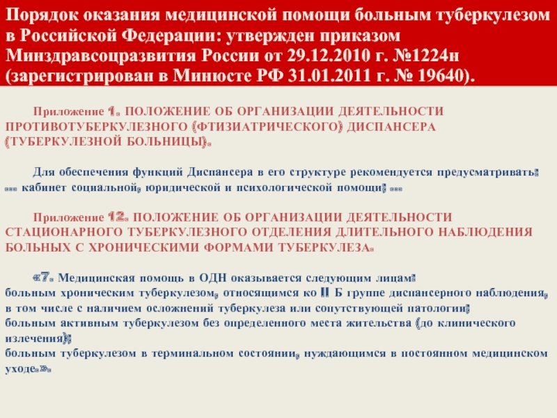 Порядок оказания медицинской помощи больным туберкулезом в Российской Федерации: утвержден приказом Минздравсоцразвития России от 29.12.2010 г. №1224н (зарегистрирован в Минюсте РФ 31.01.2011 г. № 19640).