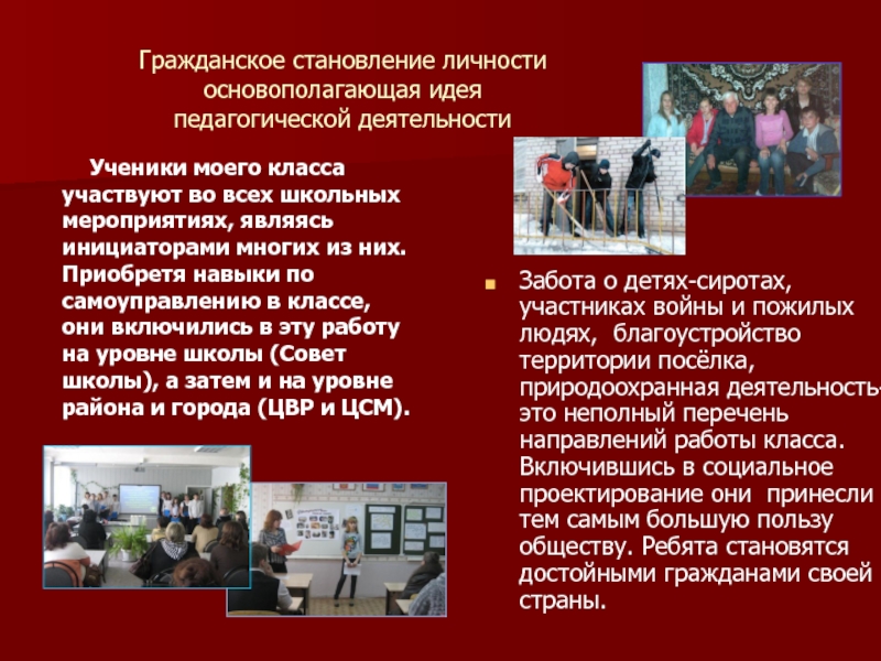 Ученики моего класса участвуют во всех школьных мероприятиях, являясь инициаторами многих из них. Приобретя навыки по самоуправлению в классе, они включились в эту работу на уровне школы (Совет школы), а затем и на уровне района и города (ЦВР и ЦСМ).