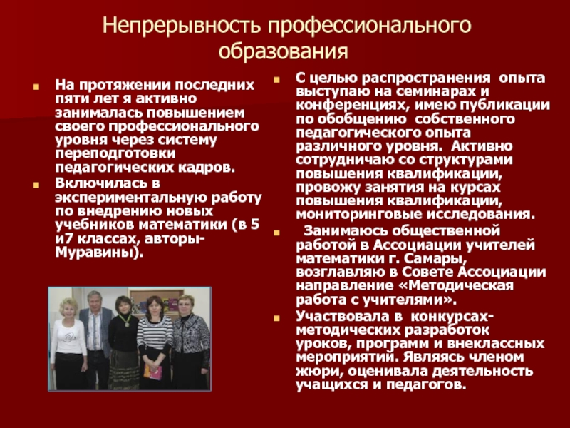 Занимаюсь общественной работой в Ассоциации учителей математики г. Самары, возглавляю в Совете Ассоциации направление «Методическая работа с учителями».