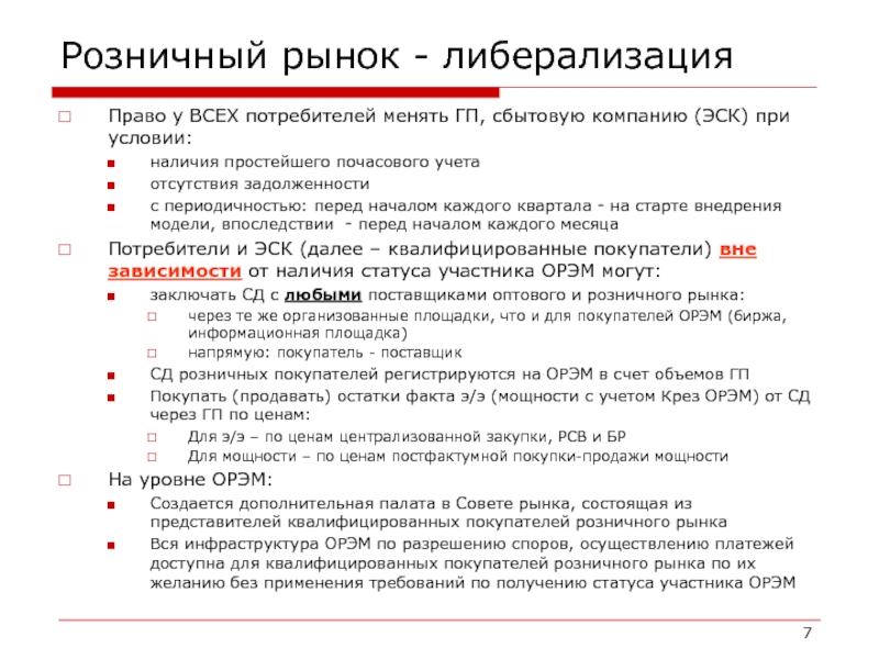 Увеличение и разнообразие покупателей ---либерализация розничного рынка и прямые отношения с генераторами, в том числе оптовыми