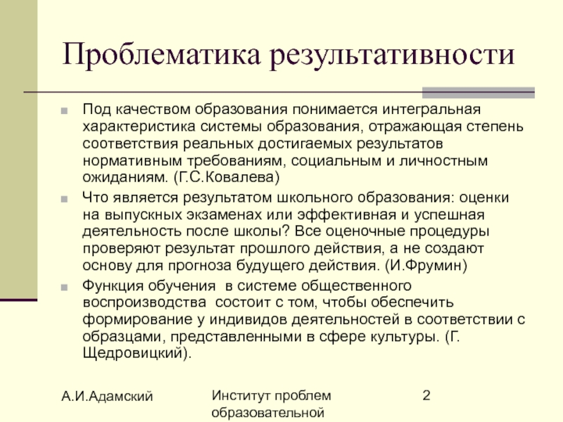 Что является результатом школьного образования: оценки на выпускных экзаменах или эффективная и успешная деятельность после школы? Все оценочные процедуры проверяют результат прошлого действия, а не создают основу для прогноза будущего действия. (И.Фрумин)