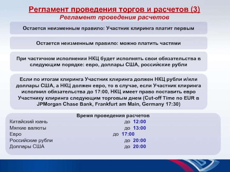 Если по итогам клиринга Участник клиринга должен НКЦ рубли и/или доллары США, а НКЦ должен евро, то в случае, если Участник клиринга исполнил обязательства до 17:00, НКЦ имеет право поставить евро Участнику клиринга следующим торговым днем (Cut-off Time по EUR в JPMorgan Chase Bank, Frankfurt am Main, Germany 17:30)