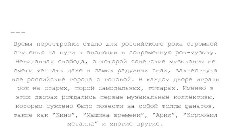 к эволюции в современную рок-музыку. Невиданная свобода, о которой советские музыканты не смели мечтать даже в самых радужных снах, захлестнула все российские города с головой. В каждом дворе играли рок на старых, порой самодельных, гитарах. Именно в этих дворах рождались первые музыкальные коллективы, которым суждено было повести за собой толпы фанатов, такие как “Кино”, “Машина времени”, “Ария”, “Коррозия металла” и многие другие.