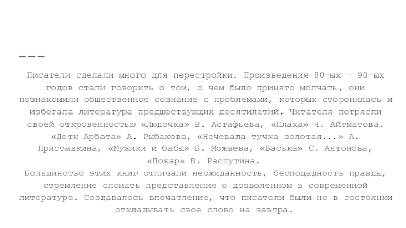 90-ых годов стали говорить о том, о чем было принято молчать, они познакомили общественное сознание с проблемами, которых сторонилась и избегала литература предшествующих десятилетий. Читателя потрясли своей откровенностью «Людочка» В. Астафьева, «Плаха» Ч. Айтматова. «Дети Арбата» А. Рыбакова, «Ночевала тучка золотая...» А. Приставкина, «Мужики и бабы» Б. Можаева, «Васька» С. Антонова, «Пожар» В. Распутина.