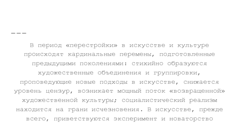 и культуре происходят кардинальные перемены, подготовленные предыдущими поколениями: стихийно образуются художественные объединения и группировки, проповедующие новые подходы в искусстве, снижается уровень цензур, возникает мощный поток «возвращенной» художественной культуры; социалистический реализм находится на грани исчезновения. В искусстве, прежде всего, приветствуются эксперимент и новаторство