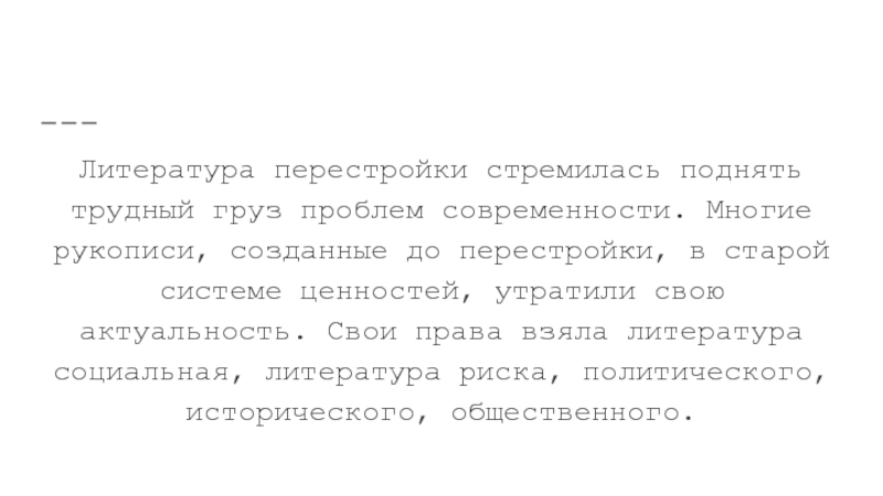 Литература перестройки стремилась поднять трудный груз проблем современности. Многие рукописи,