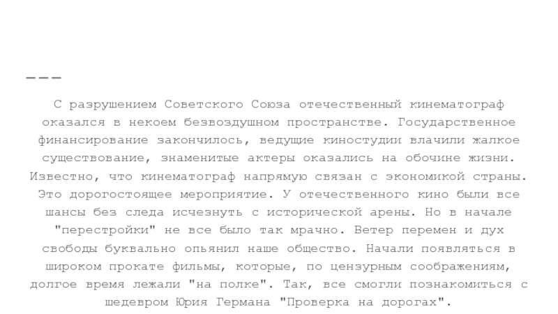 пространстве. Государственное финансирование закончилось, ведущие киностудии влачили жалкое существование, знаменитые актеры оказались на обочине жизни. Известно, что кинематограф напрямую связан с экономикой страны. Это дорогостоящее мероприятие. У отечественного кино были все шансы без следа исчезнуть с исторической арены. Но в начале "перестройки" не все было так мрачно. Ветер перемен и дух свободы буквально опьянил наше общество. Начали появляться в широком прокате фильмы, которые, по цензурным соображениям, долгое время лежали "на полке". Так, все смогли познакомиться с шедевром Юрия Германа "Проверка на дорогах".