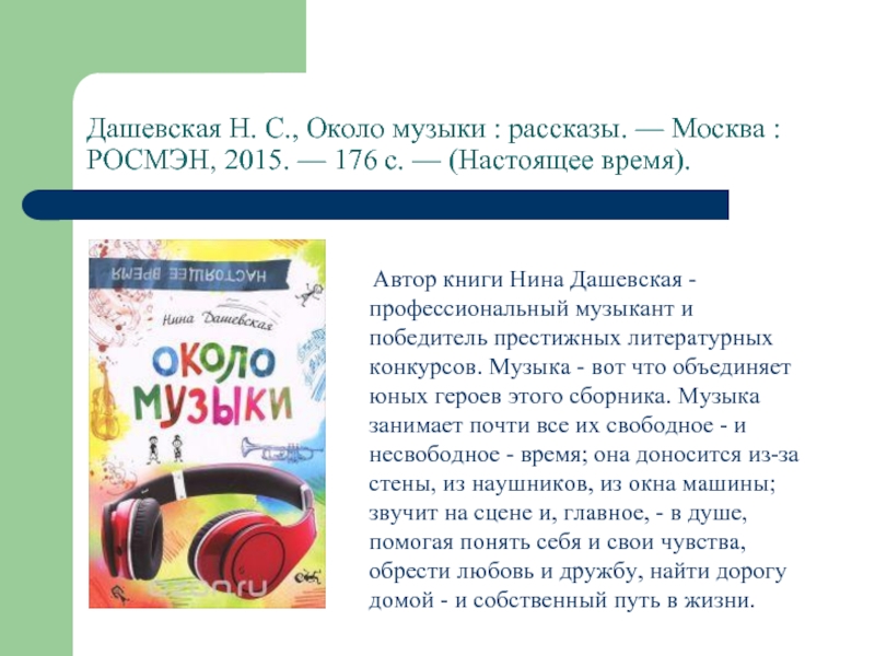 Автор книги Нина Дашевская - профессиональный музыкант и победитель престижных литературных конкурсов. Музыка - вот что объединяет юных героев этого сборника. Музыка занимает почти все их свободное - и несвободное - время; она доносится из-за стены, из наушников, из окна машины; звучит на сцене и, главное, - в душе, помогая понять себя и свои чувства, обрести любовь и дружбу, найти дорогу домой - и собственный путь в жизни.