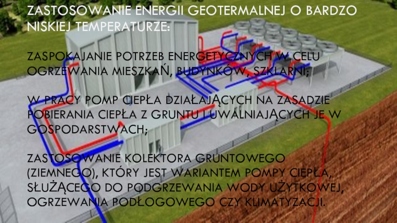 Слайд 9ZASTOSOWANIE ENERGII GEOTERMALNEJ O BARDZO NISKIEJ TEMPERATURZE: