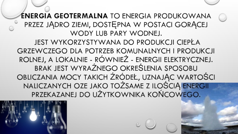 Слайд 2ENERGIA GEOTERMALNA TO ENERGIA PRODUKOWANA PRZEZ JĄDRO ZIEMI, DOSTĘPNA W POSTACI
