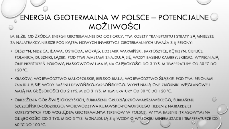 GEOTERMALNEJ DO ODBIORCY, TYM KOSZTY TRANSPORTU I STRATY SĄ MNIEJSZE. ZA NAJATRAKCYJNIEJSZE POD KĄTEM NOWYCH INWESTYCJI GEOTERMALNYCH UWAŻA SIĘ REJONY: