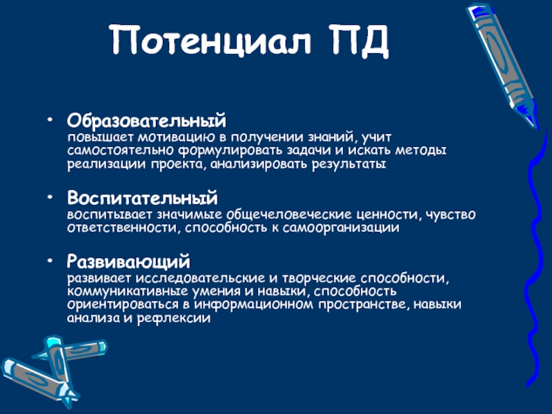 повышает мотивацию в получении знаний, учит самостоятельно формулировать задачи и искать методы реализации проекта, анализировать результаты