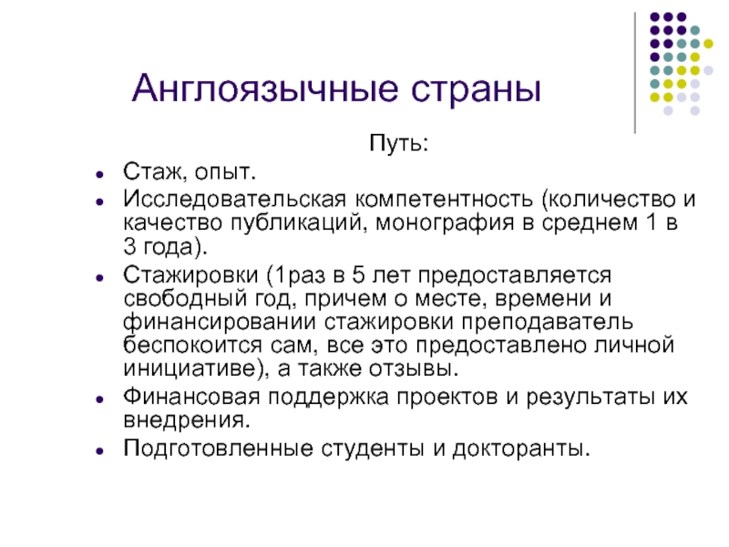 Стажировки (1раз в 5 лет предоставляется свободный год, причем о месте, времени и финансировании стажировки преподаватель беспокоится сам, все это предоставлено личной инициативе), а также отзывы.