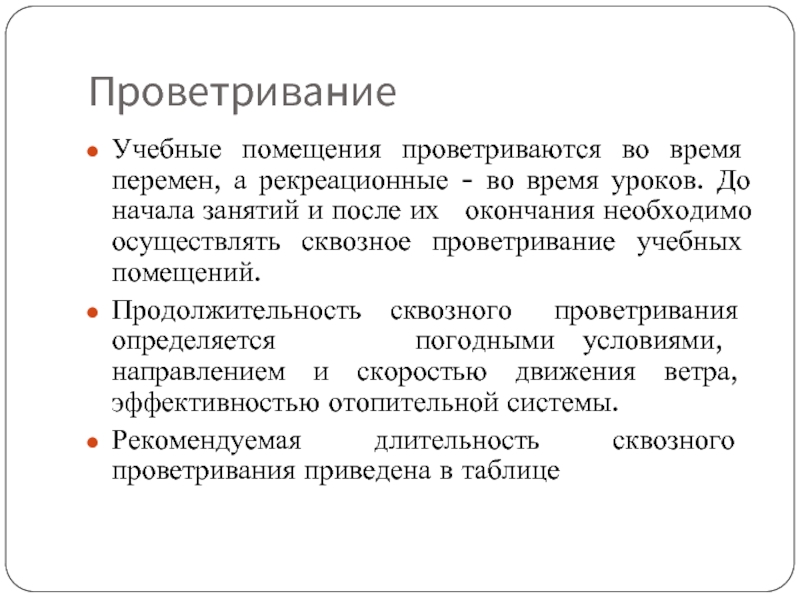 Продолжительность сквозного проветривания определяется погодными условиями, направлением и скоростью движения ветра, эффективностью отопительной системы.