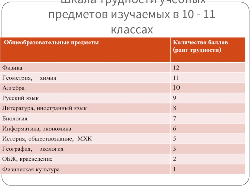Шкала трудности учебных предметов изучаемых в 10 - 11 классах