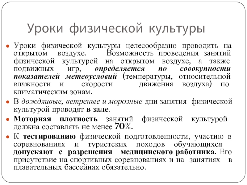К тестированию физической подготовленности, участию в соревнованиях и туристских походов обучающихся допускают с разрешения медицинского работника. Его присутствие на спортивных соревнованиях и на занятиях в плавательных бассейнах обязательно.