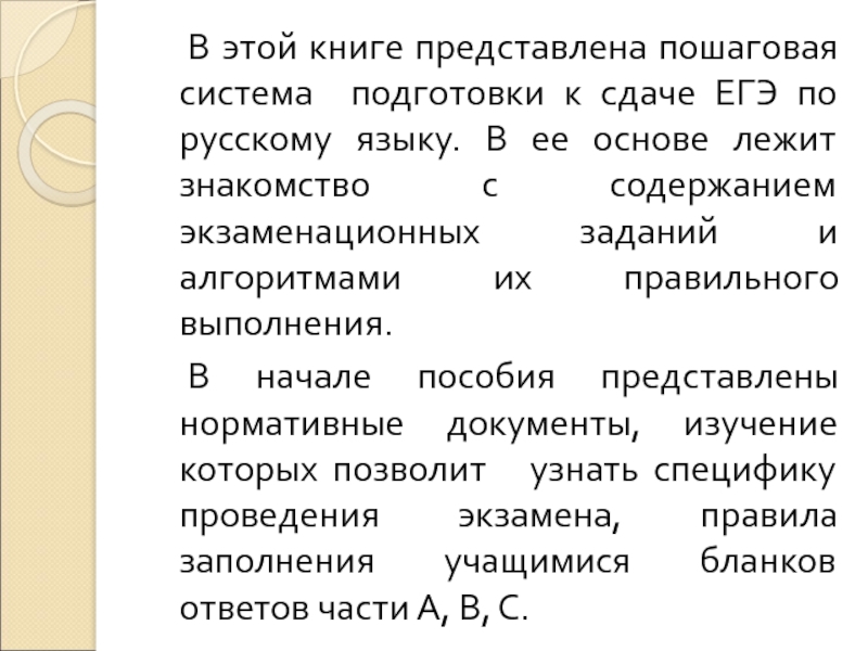 Слайд 4 В этой книге представлена пошаговая система подготовки к сдаче ЕГЭ по