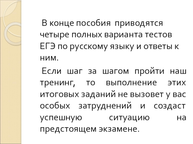 Если шаг за шагом пройти наш тренинг, то выполнение этих итоговых заданий не вызовет у вас особых затруднений и создаст успешную ситуацию на предстоящем экзамене.
