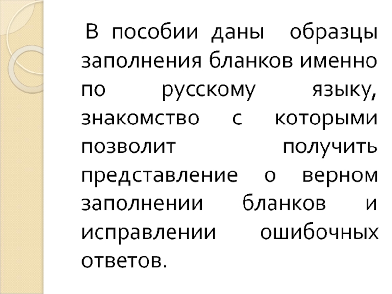 Слайд 5 В пособии даны образцы заполнения бланков именно по русскому языку, знакомство