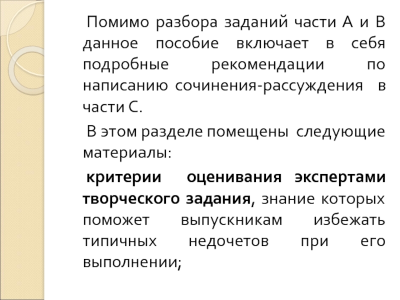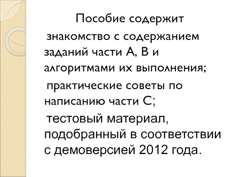 Слайд 11 Помимо разбора заданий части А и В данное пособие включает в