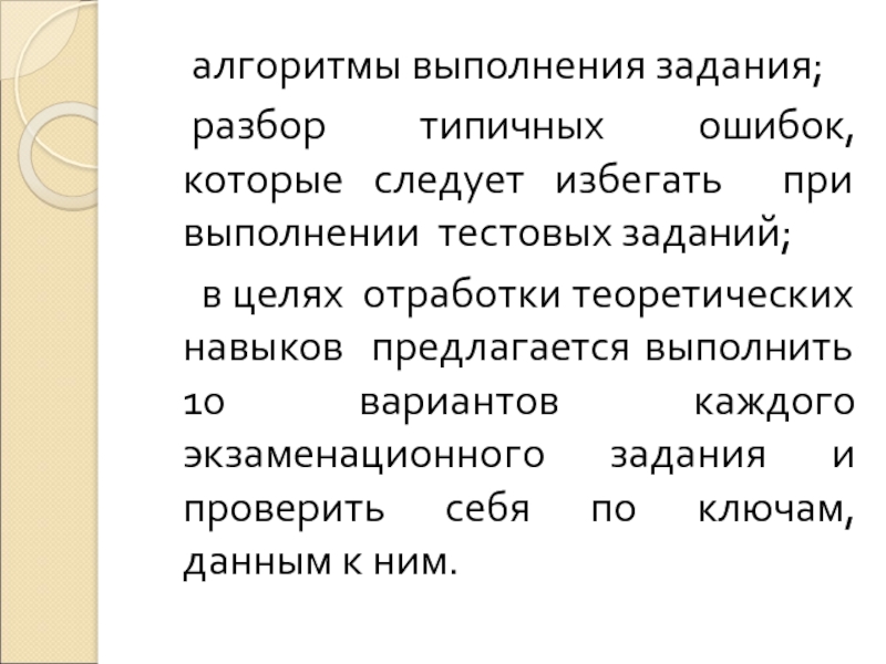 в целях отработки теоретических навыков предлагается выполнить 10 вариантов каждого экзаменационного задания и проверить себя по ключам, данным к ним.