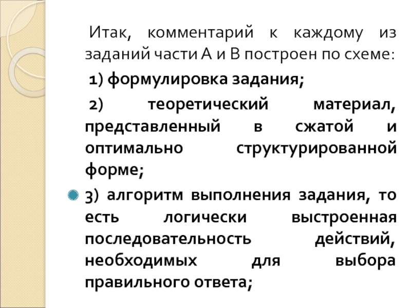 Слайд 8 Итак, комментарий к каждому из заданий части А и В построен
