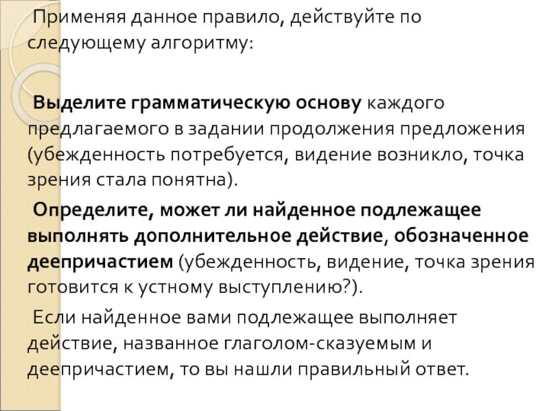 Определите, может ли найденное подлежащее выполнять дополнительное действие, обозначенное деепричастием (убежденность, видение, точка зрения готовится к устному выступлению?).