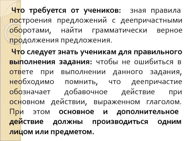 Что следует знать ученикам для правильного выполнения задания: чтобы не ошибиться в ответе при выполнении данного задания, необходимо помнить, что деепричастие обозначает добавочное действие при основном действии, выраженном глаголом. При этом основное и дополнительное действие должны производиться одним лицом или предметом.