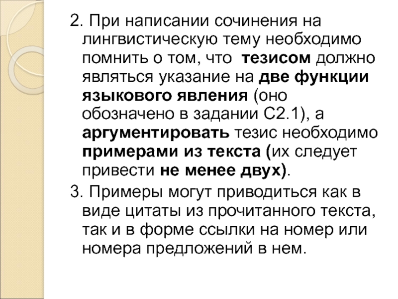 что тезисом должно являться указание на две функции языкового явления (оно обозначено в задании С2.1), а аргументировать тезис необходимо примерами из текста (их следует привести не менее двух).