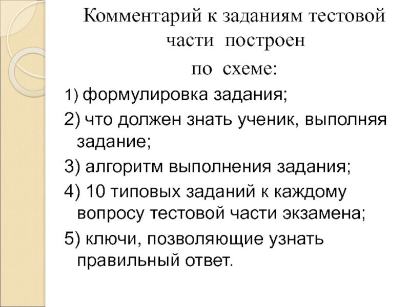 Слайд 21 Комментарий к заданиям тестовой части построен